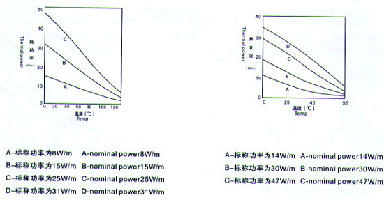从热功率一温度特性曲线中选择自控温加热电缆的功率输出Qh应等于或大于管道的热损失Qp ,对于非金属管道,曲线中的Qh应乘以0.7。